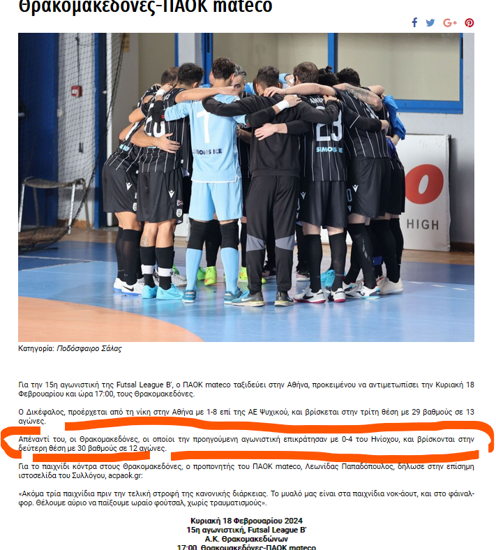 Επόμενη αγωνιστική υποχρέωση για το σύνολο του Λεωνίδα Παπαδόπουλου, την Κυριακή 25 Φεβρουαρίου και ώρα 14:00, εντός έδρας, κόντρα στο Καρπενήσι, στο πλαίσιο της 16ης αγωνιστικής της Futsal League B'.