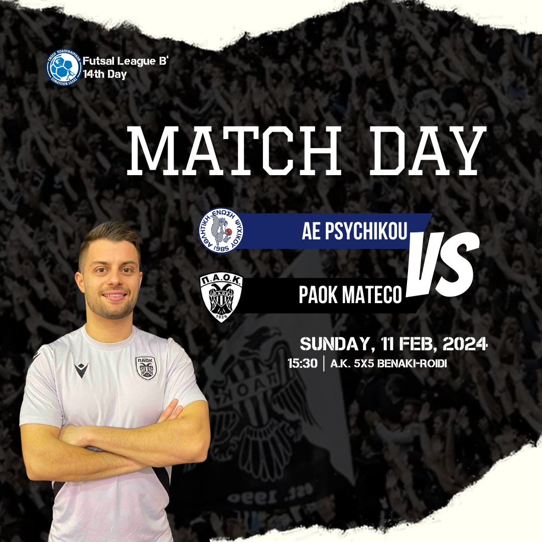 Για την 14η αγωνιστική της Futsal League B', ο ΠΑΟΚ mαteco ταξιδεύει στην Αθήνα, προκειμένου να αντιμετωπίσει την Κυριακή 11 Φεβρουαρίου και ώρα 15:30, την ΑΕ Ψυχικού.