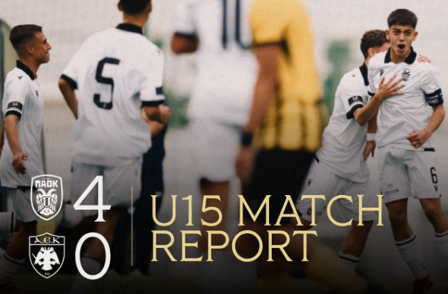 Με άνεση η Κ15 συνέχισε με το απόλυτο, επικρατώντας 4-0 της ΑΕΚ στο ματς της 7ης αγωνιστικής, που έγινε το μεσημέρι του Σαββάτου στη Σουρωτή. Πέντε παιχνίδια, 15 βαθμοί για τον ΠΑΟΚ και κορυφή στον βαθμολογικό πίνακα.