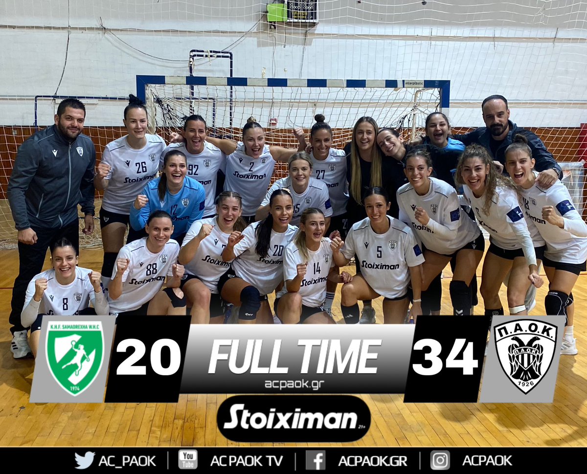 Την πρόκριση στο Round 3 του EHF European Women's Cup πήρε ο ΠΑΟΚ, επικρατώντας και στο δεύτερο παιχνίδι της Σαμαντρέζα με 20-34, και έτσι με συνολικό σκορ 72-58 πέρασε στην επόμενη φάση.