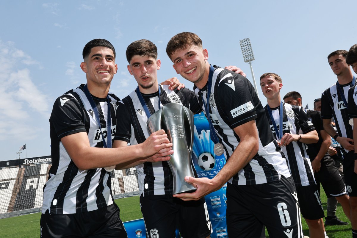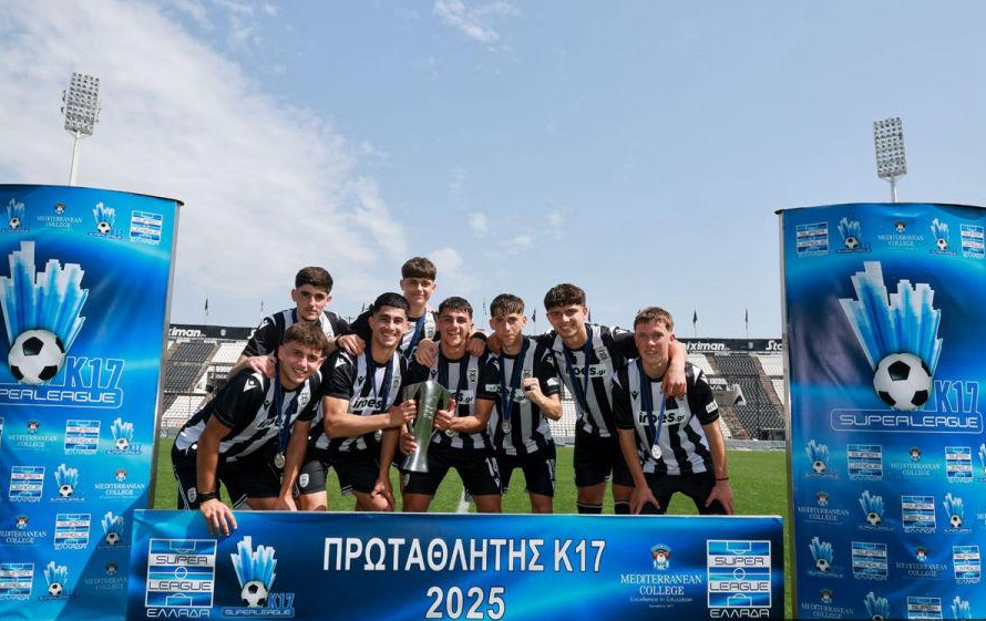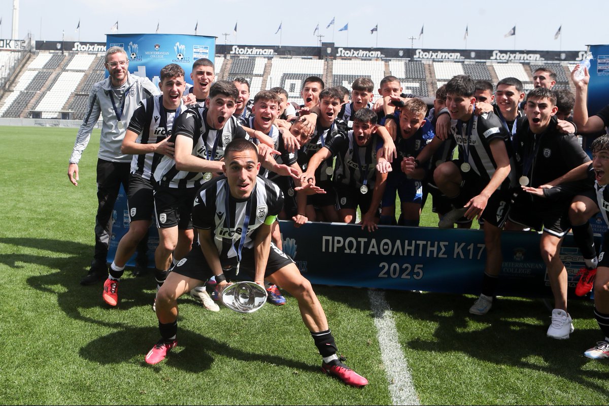 Η Κ17 μας πανηγύρισε στο γήπεδο της Τούμπας, το πρωτάθλημα της σεζόν 2024-25, το οποίο είχε ήδη κατακτήσει μαθηματικά τρεις αγωνιστικές πριν το τέλος. Ένα back to back πρωτάθλημα, το πρώτο πανελλήνιο, το έκτο συνολικά του ΠΑΟΚ στην συγκεκριμένη ηλικιακή κατηγορία. Κέρδισε 1-0 τον Παναθηναϊκό (18η αγωνιστική) με γκολ του Κυριαζίδη στο 51′, έπειτα από την ασίστ του Παπαδόπουλου (είχε προηγηθεί στο 33′ δοκάρι του Γκιόκα) και χάρηκε με την ψυχή της την απονομή και τη μίνι φιέστα στην Τούμπα, όπως φυσικά και το ότι τα μετάλλια των πρωταθλητών παραδόθηκαν από τα χέρια των Αντρέ Βιεϊρίνια και Δημήτρη Πέλκα .