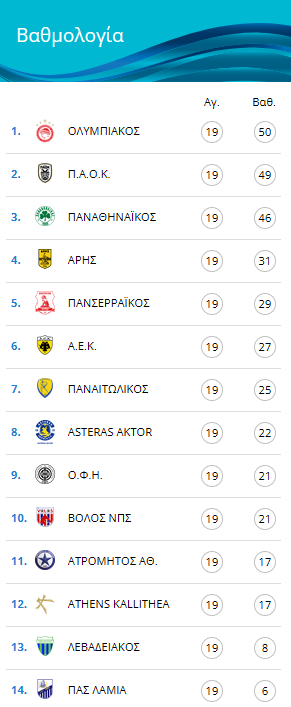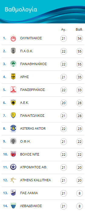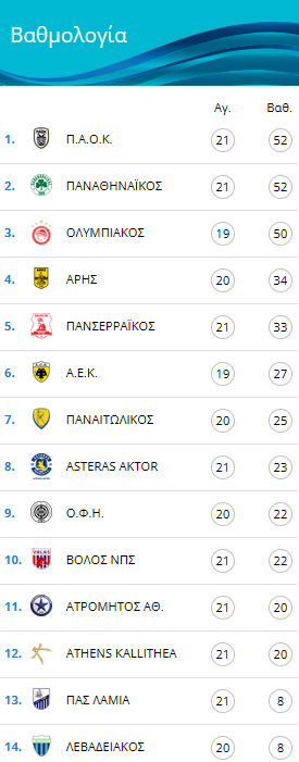 Αυτή τη στιγμή ο ΠΑΟΚ είναι στους 55 βαθμούς σε 22 ματς, όσους έχει και ο Παναθηναϊκός, με τον Ολυμπιακό να προηγείται με 56 βαθμούς σε 21 παιχνίδια. Απομένουν τέσσερις αγώνες για την λήξη του πρωταθλήματος, με τον Δικέφαλο να πηγαίνει στο Αγρίνιο για να αντιμετωπίσει τον Παναιτωλικό το επόμενο σαββατοκύριακο.