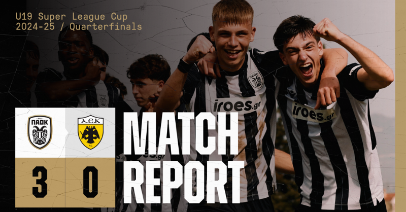 “Καθάρισε” τον προημιτελικό κυπέλλου με την ΑΕΚ η Κ19 με 3-0, στο ματς που έγινε το μεσημέρι του Σαββάτου στη Σουρωτή και προκρίθηκε στον ημιτελικό, όπου θα αντιμετωπίσει τον Παναθηναϊκό.