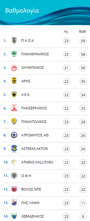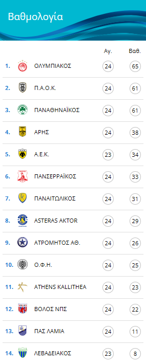 Ο ΠΑΟΚ πρόσθεσε άλλους τρεις βαθμούς στην συγκομιδή του, φτάνοντας πια στους 61 μετά από 24 αγώνες. Είναι στη δεύτερη θέση μαζί με τον Παναθηναϊκό, τον οποίο αντιμετωπίζει εκτός έδρας, την επόμενη αγωνιστική. Τελευταίο ματς είναι το εντός έδρας με τον Βόλο.