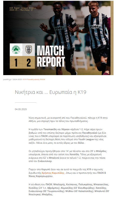 Επόμενο και τελευταίο ματς αυτής της απαιτητικής σεζόν για την Κ19 μας είναι ο τελικός κυπέλλου της Super League, που θα διεξαχθεί στο Ηράκλειο της Κρήτης στις 24 Μαϊου, με αντίπαλο τον Ολυμπιακό.
