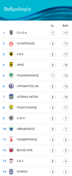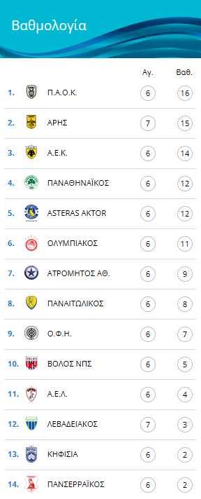 Ο ΠΑΟΚ είναι πια στους 17 βαθμούς μετά από επτά παιχνίδια, όσους έχει και ο Ολυμπιακός με ένα παιχνίδι περισσότερο. Ο Παναθηναϊκός είναι στους 15 βαθμούς μετά από επτά ματς και αγωνίζεται αύριο Κυριακή.