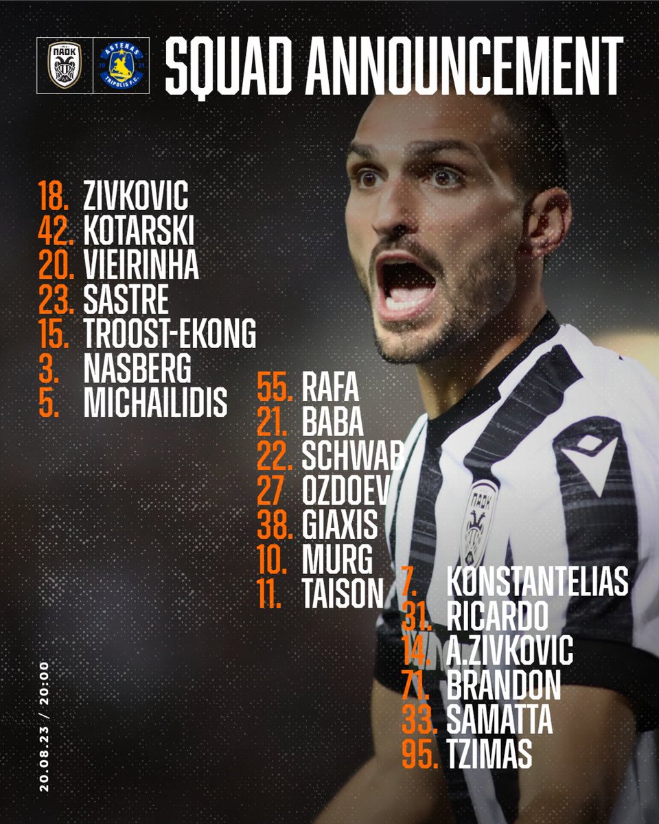 Εκτός αποστολής οι: Κεντζιόρα, Βρακάς, Νάρεϊ και Βρακάς.