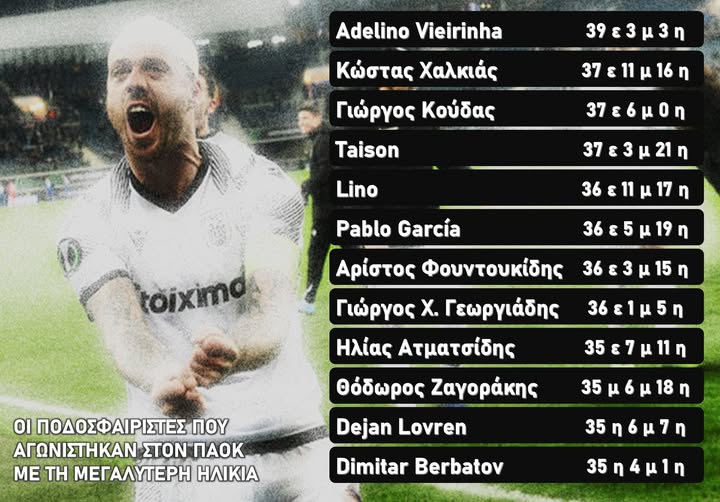 Ο Adelino Vieirinha θα αγωνιστεί την Κυριακή σε ηλικία 39 ετών, 3 μηνών και 17 ημερών. Πέρα από όλα τα θαυμαστά που έχει επιτύχει με τα ασπρόμαυρα, ο επικείμενος αποχαιρετισμός του οριοθετεί ένα απλησίαστο, με τα σημερινά δεδομένα, ρεκόρ.Η λίστα με τους ποδοσφαιριστές που έχουν παίξει στον ΠΑΟΚ στη μεγαλύτερη ηλικία.
