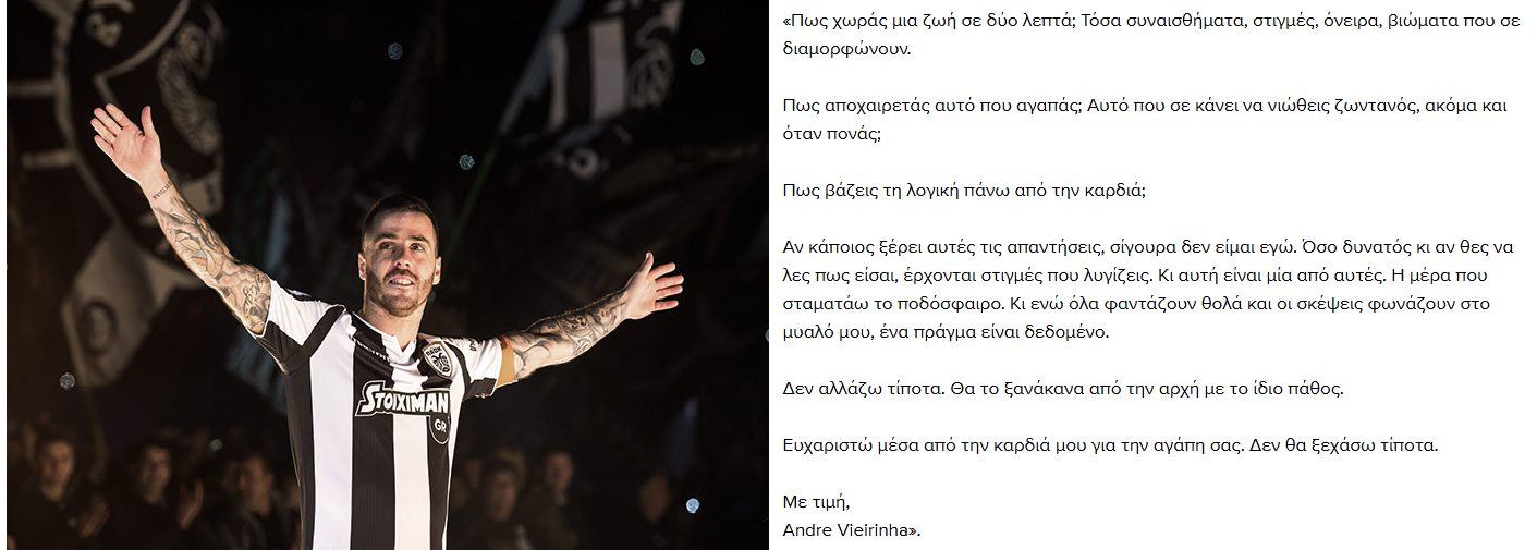 Αντρέ, μαζί γκρεμισαμε το κατεστημένο και ο ΛΑΟΣ του ΠΑΟΚ δεν θα ξεχάσει ποτέ την προσφορά σου και τη συμμετοχή σου σε αυτό. Η κλωτσιά σου στον τελικό του ΟΑΚΑ το ’18 είναι η πιο εμβληματική εικόνα της αλλαγής εποχής για το σύλλογο και θα μείνει για πάντα στο μυαλό μας όπως και όλα τα υπόλοιπα που πέτυχες μαζί με τα άλλα παιδιά, για το μεγαλείο του Δικέφαλου.