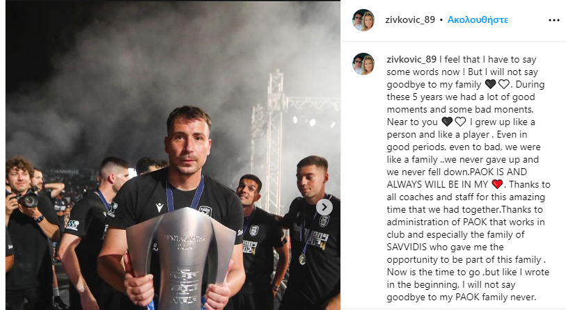 Ποτέ δεν τα παρατήσαμε και ποτέ δεν πέσαμε κάτω. Ο ΠΑΟΚ ΕΙΝΑΙ ΚΑΙ ΠΑΝΤΑ ΘΑ ΕΙΝΑΙ ΣΤΗΝ ΚΑΡΔΙΑ ΜΟΥ. Θέλω να ευχαριστήσω όλους τους προπονητές και τα μέλη του τεχνικού επιτελείου για όλες τις απίστευτες στιγμές που είχαμε μαζί. Ευχαριστώ την διοίκηση του ΠΑΟΚ που δουλεύει για τον σύλλογο και ειδικά την οικογένεια Σαββίδη που μου έδωσε την ευκαιρία να γίνω μέλος της οικογένειας του ΠΑΟΚ. Τώρα έφτασε η στιγμή να φύγω, αλλά όπως έγραψα και στο ξεκίνημα δεν θα πω ποτέ αντίο στην οικογένεια του ΠΑΟΚ»
